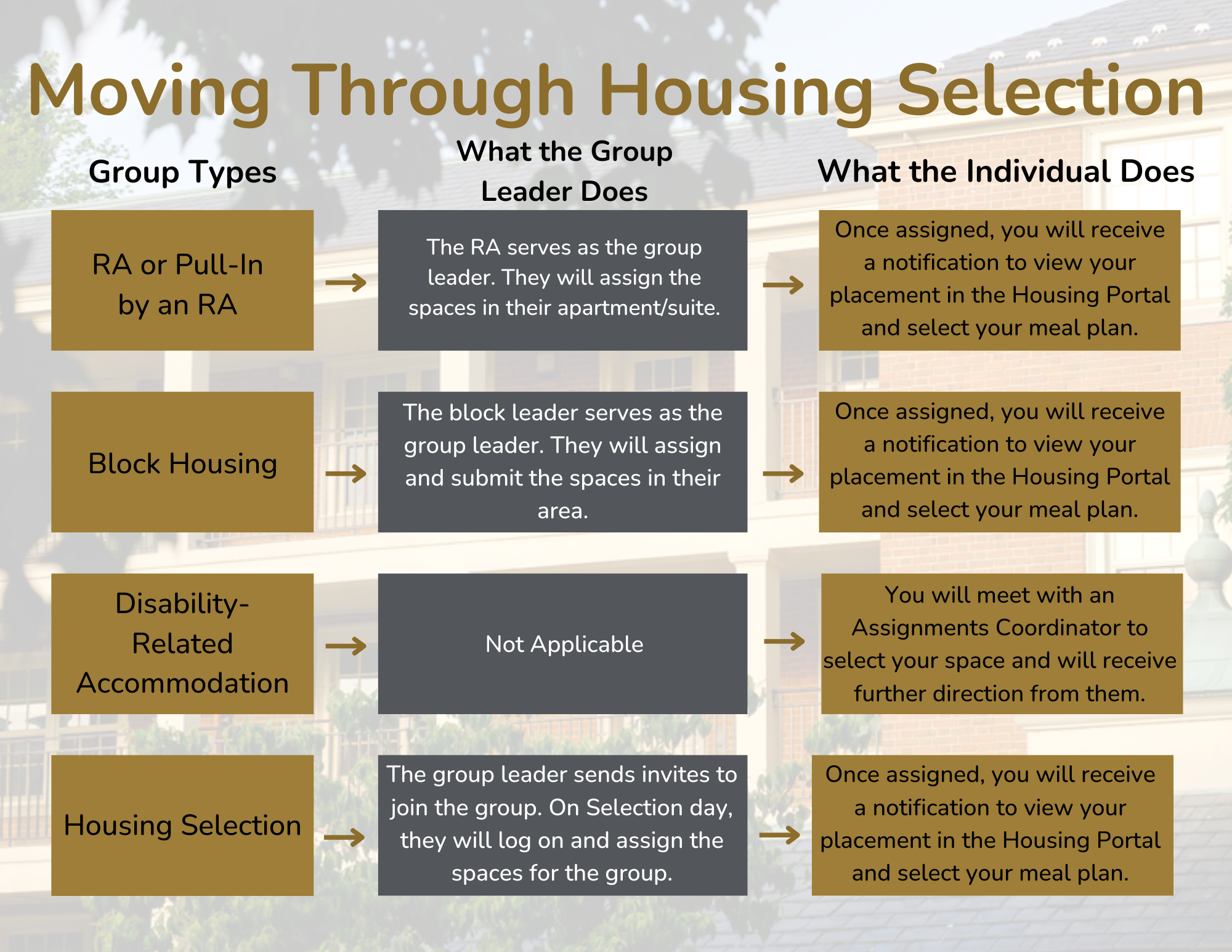 We understand that Housing Selection may get a bit confusing. Please reference this document that was created to help share how different group types move through the housing selection process.